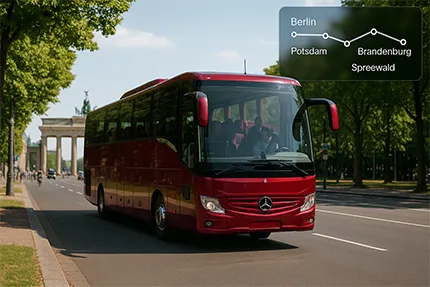 Zu unserem umfangreichen Angebot unserer Busvermietung gehören Fahrten mit Abfahrt oder Ziel im Stadtgebiet und dem direkten Umland. Besonders häufig werden Buchungen aus dem sogenannten Speckgürtel angefragt – darunter Orte wie Potsdam oder Oranienburg.